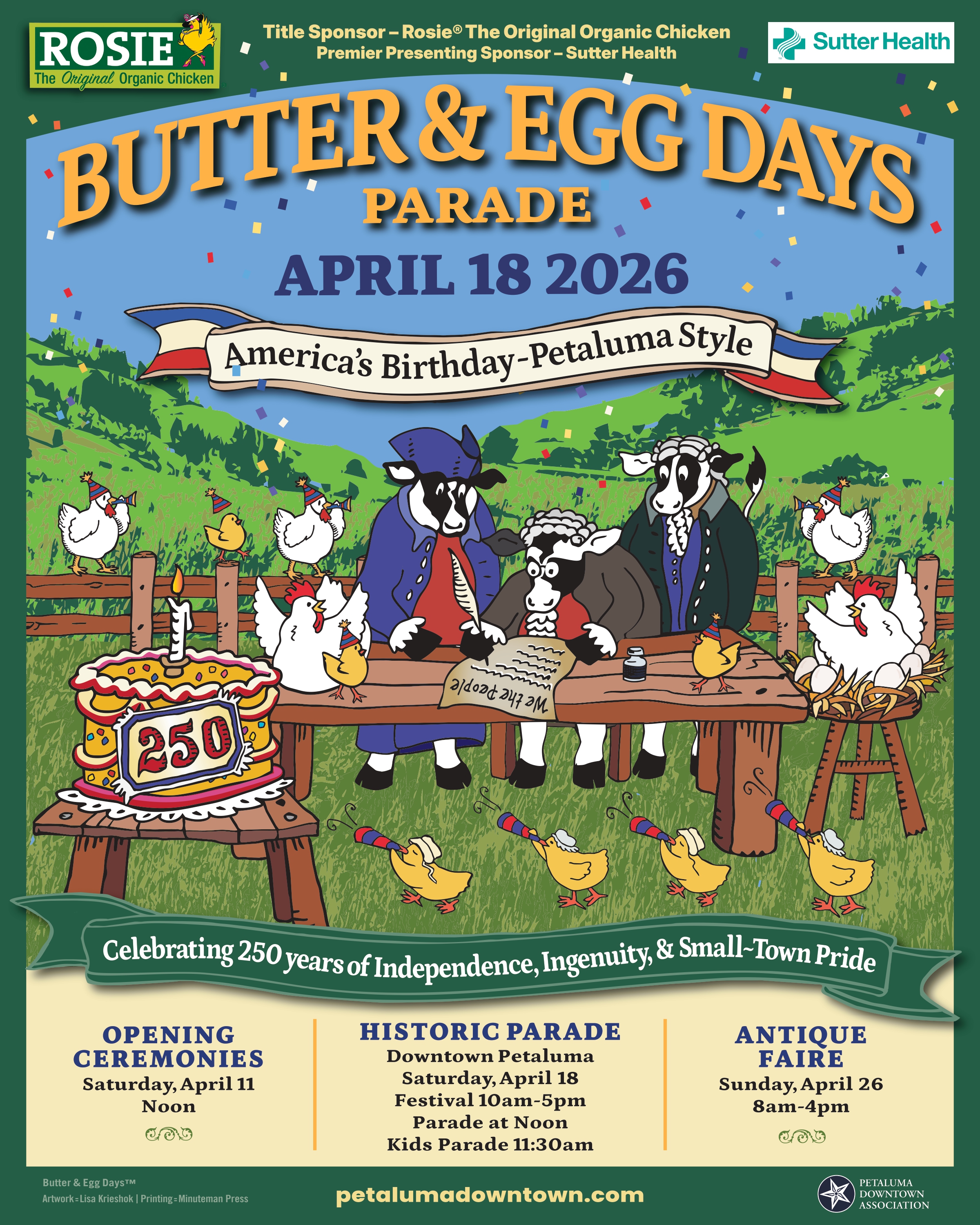 “Americas’ Birthday – Petaluma Style” celebrates the nation’s 250th Birthday by honoring Petaluma’s deep agricultural roots and hometown spirit. This year’s Butter & Egg Days Parade recognizes the farmers, families, immigrants, makers, entrepreneurs, and creatives whose hard work, imagination, and ingenuity reflect the enduring American Dream. This celebration also pays respect to the Indigenous peoples who first stewarded this land, the courage of our founders, and the dedication of the dairy and egg farming community that shaped our town. Rooted in community, innovation, and independence, the parade celebrates the small-town spirit that continues to make Petaluma a vibrant place to call home. Head to Downtown Petaluma and celebrate with our community on this day of fun, history, and local pride!